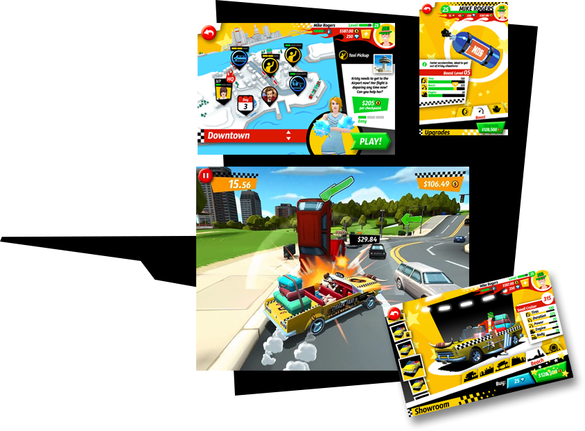 A new style for a new audience. We created a new visual identity that took the essence of the original IP and made it playful and relevant to new audiences. Palettes, textures, logos, designs and concepts for a new Crazy Taxi were all worked on by the Midoki team.